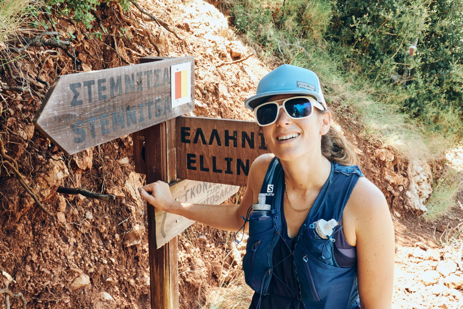 As the sun rises on day three, we set off from Vytina, ready to tackle the day ahead.Almost 40km ahead of us meant a strategic breakfast order at the bakery in Vytina.Leaving Vytnia with pastries and coffee to accompany the first kms.Early morning in the impressive ravine outside of Vytina.As we hiked through the lush countryside, we were greeted by the buzzing of bees hard at work in their hives. A reminder of the beauty and harmony of nature.Valtesiniko proved to be a great place for lunch, with several restaurants and cafes offering a variety of tasty dishes. After the previous day’s less-than-stellar experience, we were happy to find a satisfying meal to fuel us for the rest of the day’s run.After hours of running, the sight of a small ice cream shop in the quaint village of Magouliana was a welcome relief.After red and yellow, it was the turn of the green signposts to guide your way.The drag from Valtesiniko to the finish line in Lagkadia tested our endurance. As the heat beat down on us, we dug deep and pushed on to the end.